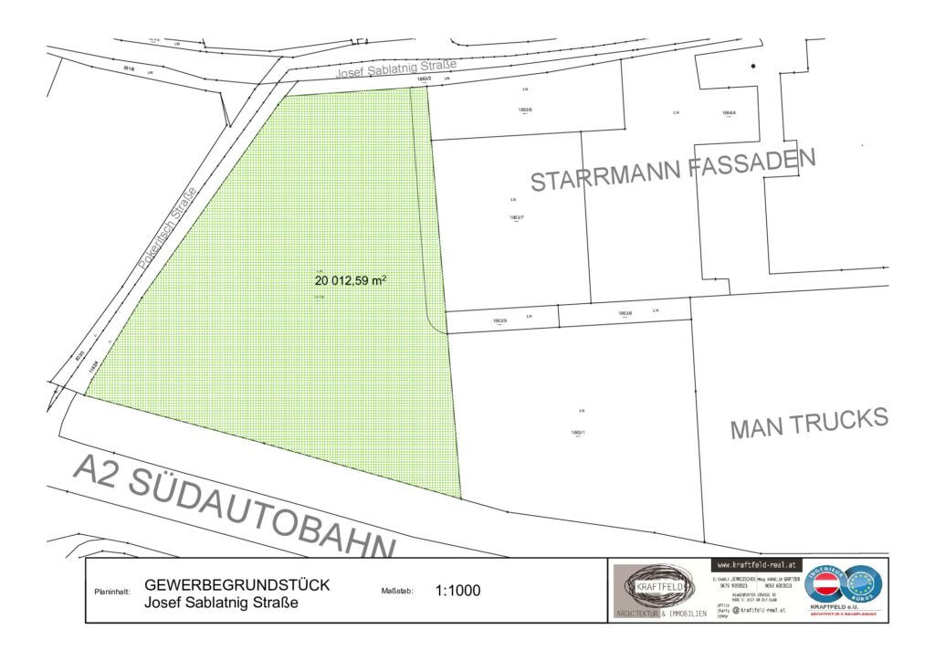Das zentral gelegene 20.000 m² große Grundstück liegt Nordöstlich vom Stadtgebiet von Klagenfurt und ist über öffentliche Straßen (Josef Sablatnig Straße) erreichbar. Direkt angrenzend sind Gewerbebetriebe, die Autobahn und noch unbebaute Ackerflächen.